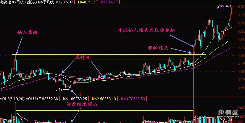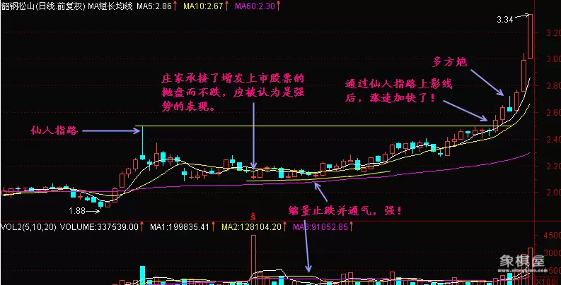 还有一种回档时间稍长的仙人指路。在小山头的仙人指路以后股价会有回落,此时会出现一组托压互变的图形,如果后面股价能冲过山头,那么就是黑马!