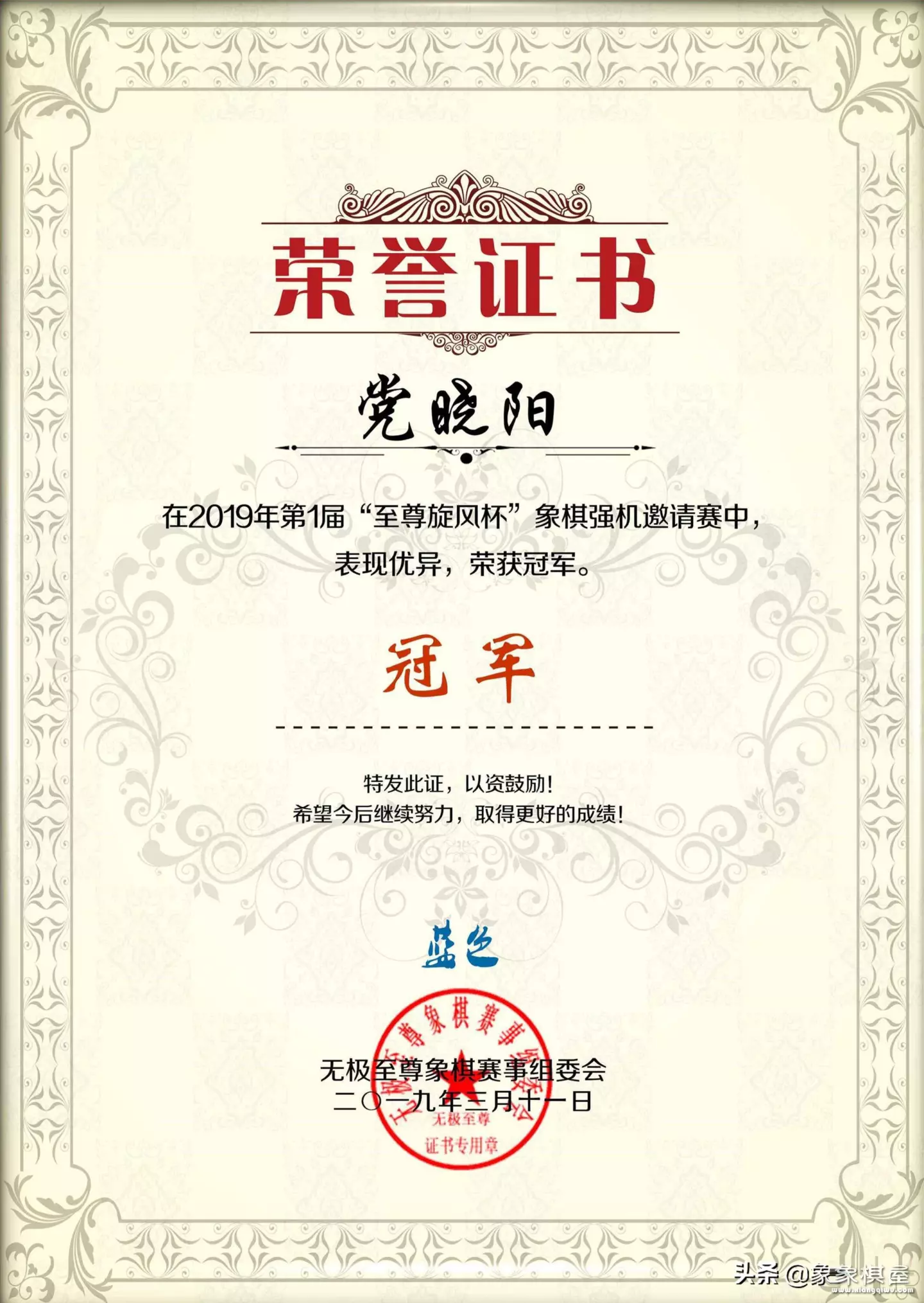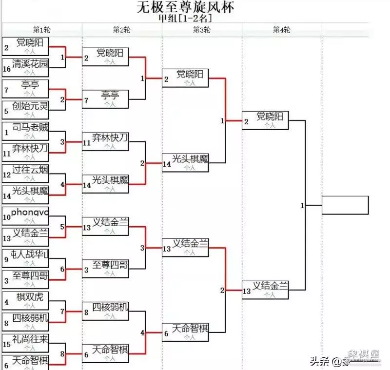 北京时间3月11日,2019年第一届无极“至尊旋风杯”软件比赛在弈天棋缘强力战罢。最终56核象棋旋风+人机神手党晓阳,两番战慢棋先后手成平,加赛突然死亡决斗,党晓阳与对手56核象棋旋风+名手(辅)+人机仙将义结金兰(中国疯),连出两场急进中兵新式弃双马大飞刀,未分高下,加赛生死局第三盘、总第5局,党晓阳运用吕钦独门绝技起马局,中盘人机操作暗渡义结金兰旋风、名手双引擎陈仓,实现超级点杀,6比4获胜,勇夺桂冠,获封人机霸主。