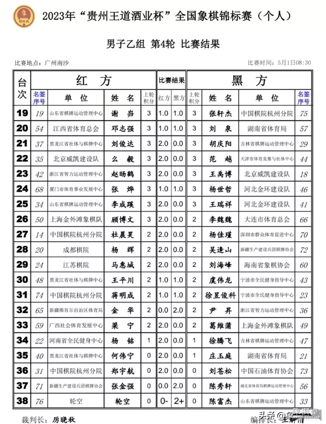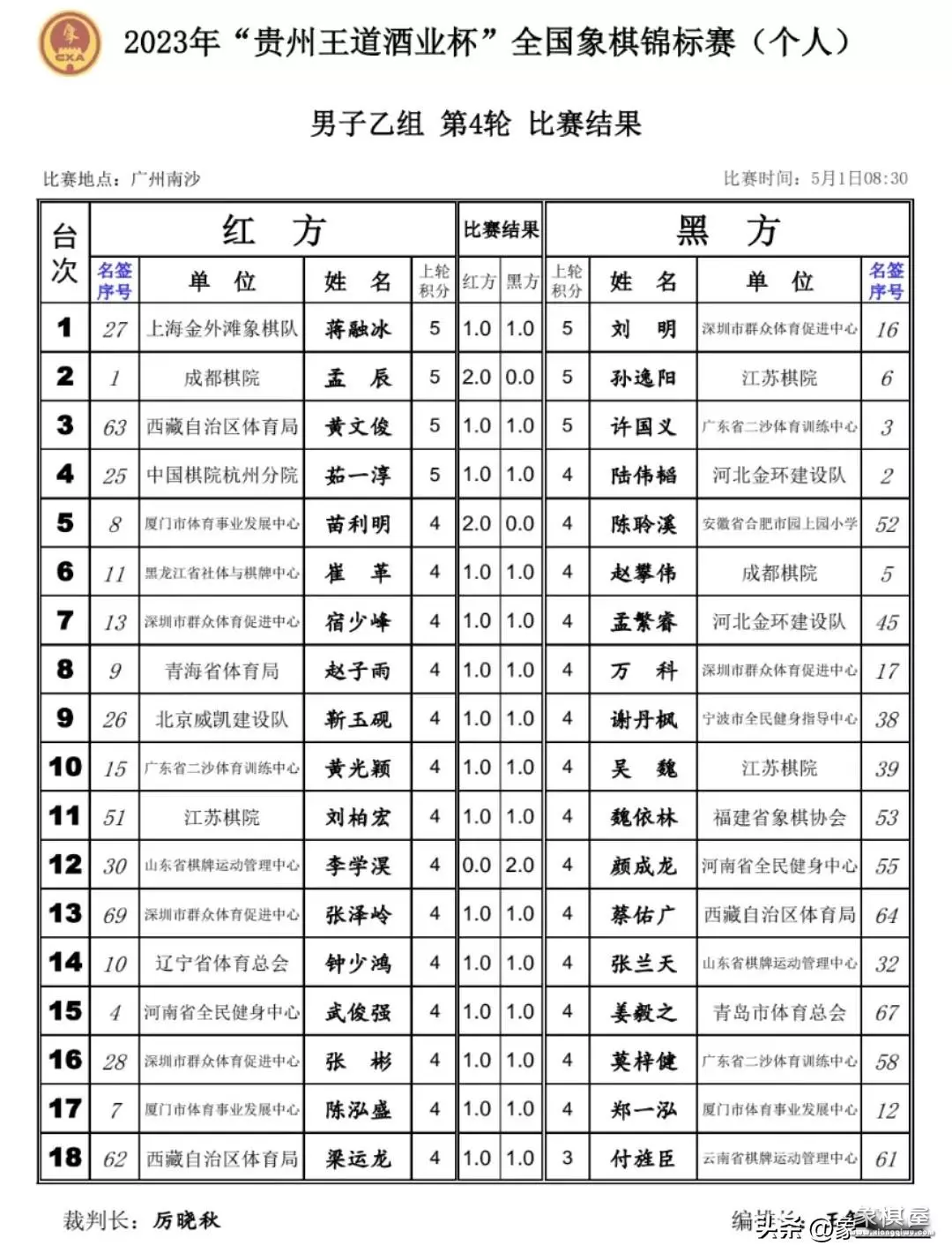 代表厦门队出战的苗利明执红棋赢下安徽队少年新星陈聆溪,崔革战平赵攀伟,孟繁睿打和宿少峰,万科和赵子雨,谢丹枫平靳玉砚,黄光颖和吴魏。