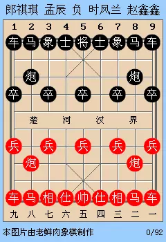 且看郑惟桐张国凤对孟辰郎祺琪这盘,郑惟桐先手飞起三相,孟辰进右马,张国凤进三兵,郎祺琪挺3卒,四人依序行棋。第七步张国凤伸炮过河将局面导入自己的准备之中,郑惟桐人称“布局专家”对此路变化也是谙熟于胸。双方迅速短兵相接,郑惟桐招招精准,孟辰郎祺琪24回合速败。