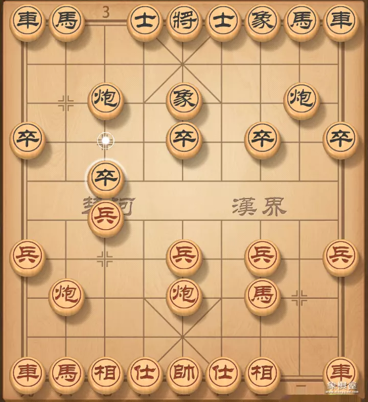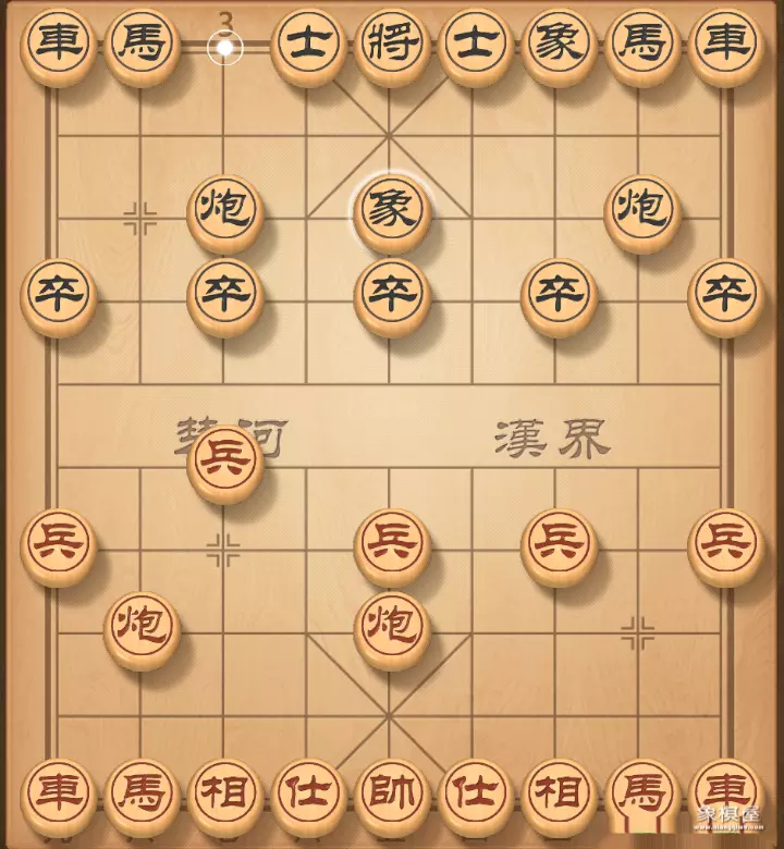 3. 马二进三 卒3进1 红黑双方形成了仙人指路转左中炮对卒底炮飞左象——黑进7卒的经典开局