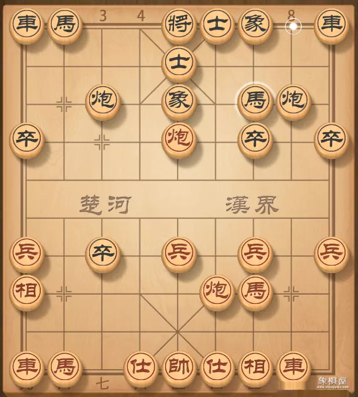 7.炮八平四 马8进7 红棋接上图还可选择炮五退二或马八退六,而在红棋走炮八平四后,黑棋可走马2进4,要略好一些,可尽快出车。