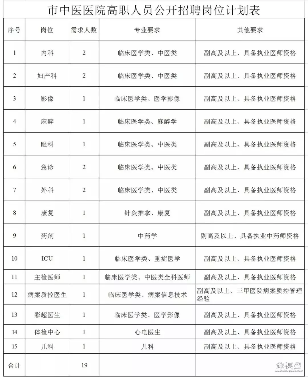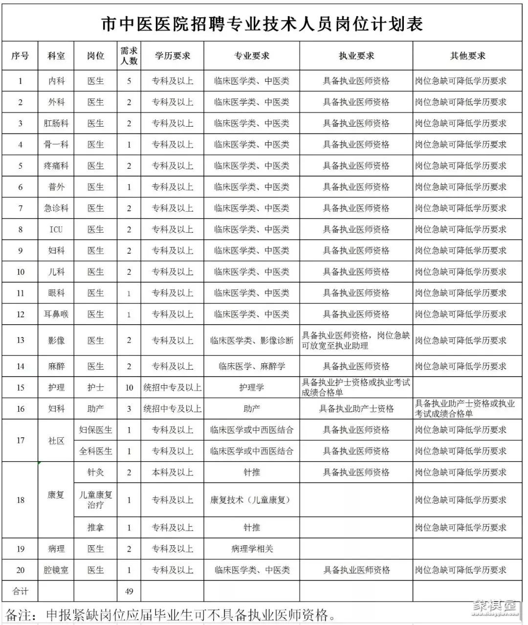 招聘对象为省内、外专科生及以上学历的执业医师。招聘专业包括全科医学、中医、b超。