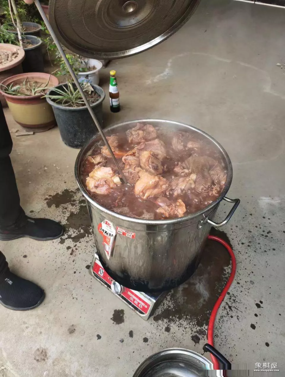 杨会平的夫人和哥哥高度支持象棋比赛,中午为棋友烹饪了一锅美味的大骨头,晚上为棋友准备了丰盛的晚宴。