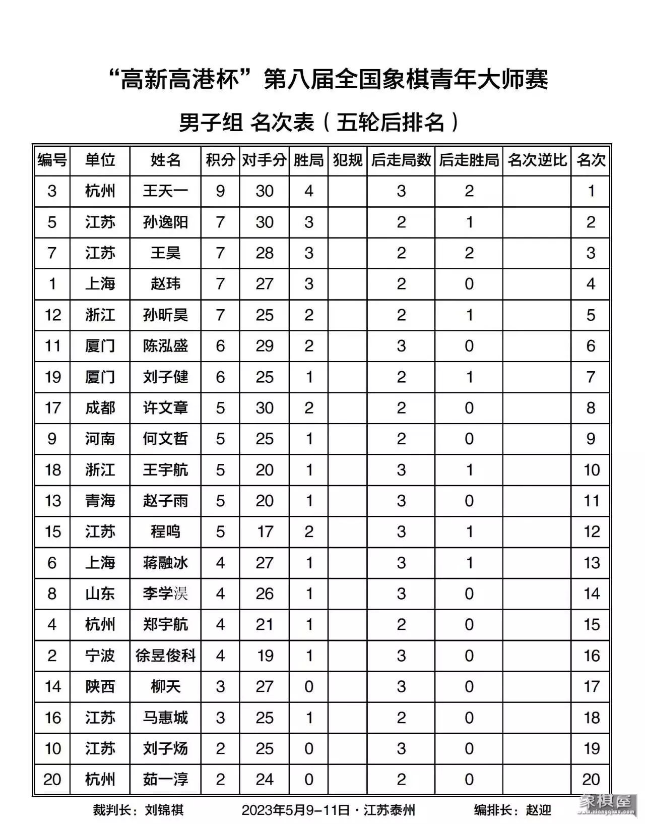 第五轮是男子组争夺出线权的最后一战。积7分的王天一与王昊几乎锁定了两个名额,而紧随其后积5分的却有7人之多。最终赵玮和孙逸阳分别击败许文章和王昊杀进四强,王天一为等级分而战,后手击败何文哲。
