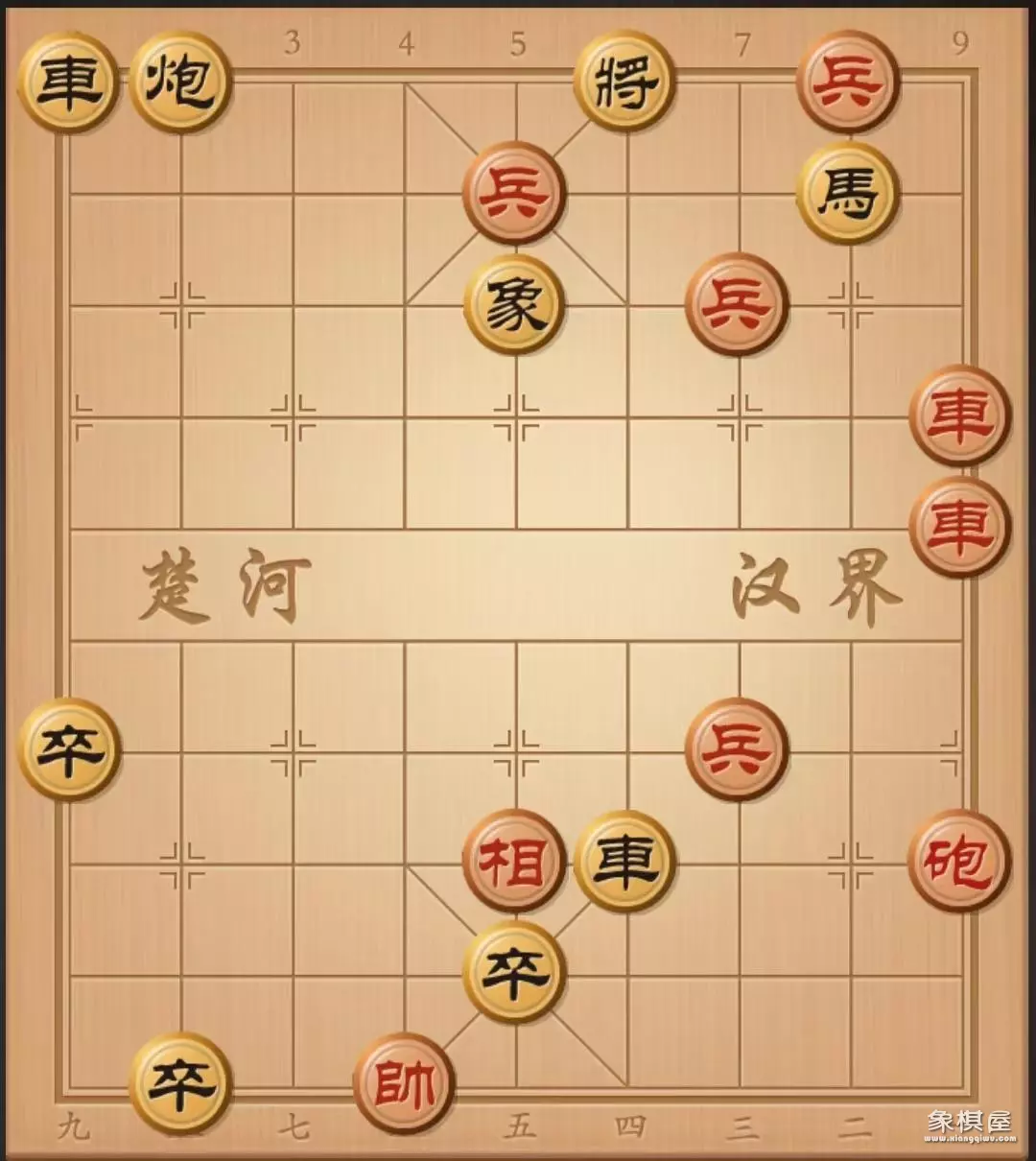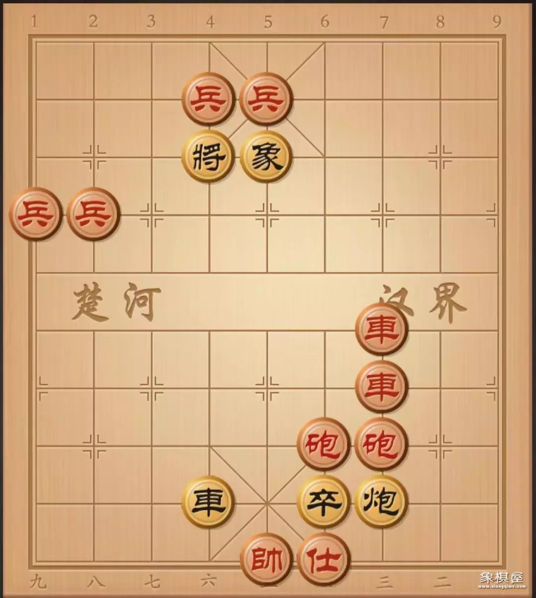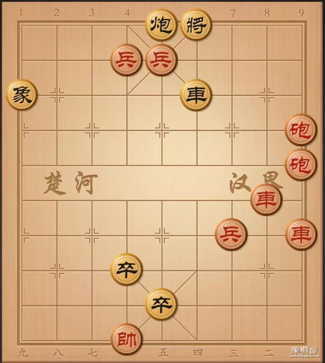 很多人看来看去,也就只看见棋盘右半边。最初级的走法是这样的:红两个车连续将军,然后炮沉底赢了。稍微进化一点的,会这样下:红车将军,黑若跳马挡住,红车吃马再将,黑车吃回来,则红兵吃黑车,然后进兵绝杀。
