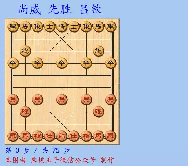 这盘棋,尚威执先手,摆下了仕角炮的阵势,吕钦应以挺7路卒。