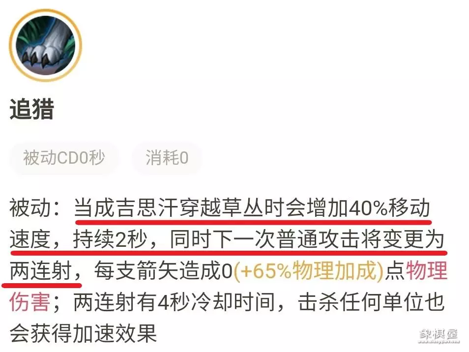 在所有射手中,唯一一个有坐骑的射手成吉思汗的被动算是比较有特色的:通过与地形的互动来给自己增加buff,提升战斗能力。在之前的版本,由于射手大多是和对手上单进行对线,双人路的优势让成吉思汗能够频繁的通过下路草丛来对对手进行压制。但是在分路调整之后,对线时的人数优势不复存在,这让成吉思汗在利用被动时需要更加谨慎,对线强度自然下降了不少。
