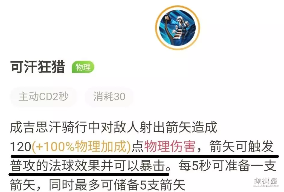 1、在伤害能力上成吉思汗有着绝大多数射手难以企及的爆发能力,在很多时候甚至不逊于一个发育良好的刺客。但是优秀的爆发能力却也带来了自身持续输出能力不足的窘境,这让成吉思汗在这个版本的团战选位极为重要,也大大增加了选取成吉思汗的局限性。