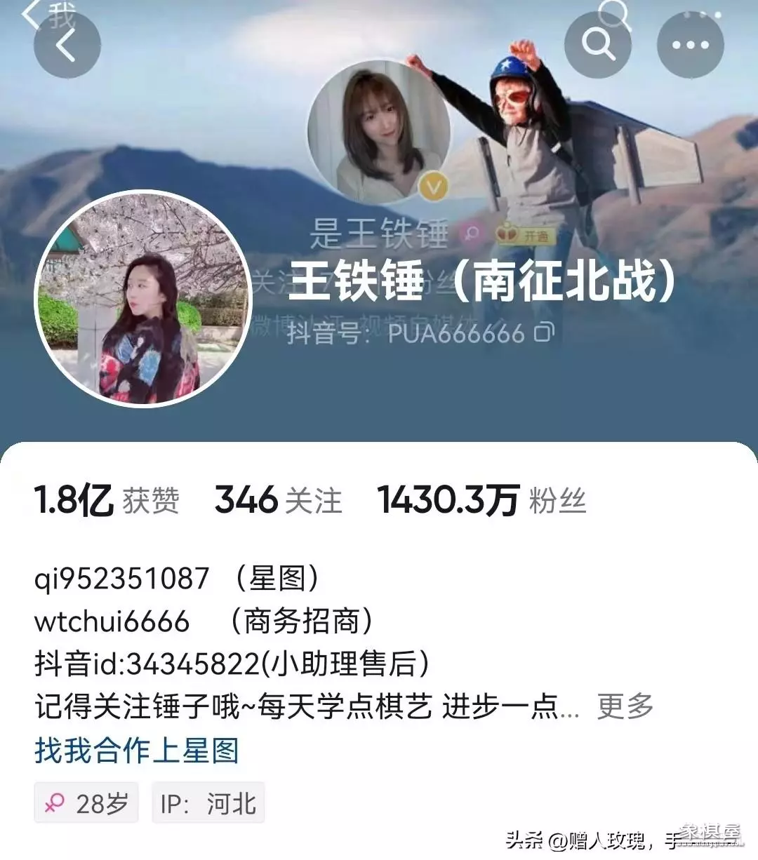 在如今自媒体盛行的时代,可以说360行,行行出状元,靠象棋赚钱最多的恐怕就是王铁锤了。王铁锤何许人也?王铁锤,真实姓名不详,资料也无从查找,小编还专门问了度娘仍是一无所获,在抖音资料里显示芳龄28岁,ip属地河北,仅此而已。这不是重点,重点是她坐拥1430.3万粉丝。
