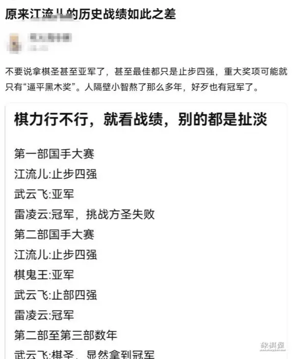 根据网友扒出的历史战绩,江流儿的荣誉平平无奇。第一次国手大赛他进不了决赛,第二次国手大赛他还是停留在四强。《新围棋少年》的棋圣是武云飞,江流儿还是拿不到冠军。江流儿的历史成绩是两次四强,一次名次不明,总体而言和棋圣不沾边。而且更离谱的是棋鬼王第一次参赛就杀进决赛勇夺亚军,超过江流儿历史最佳成绩。
