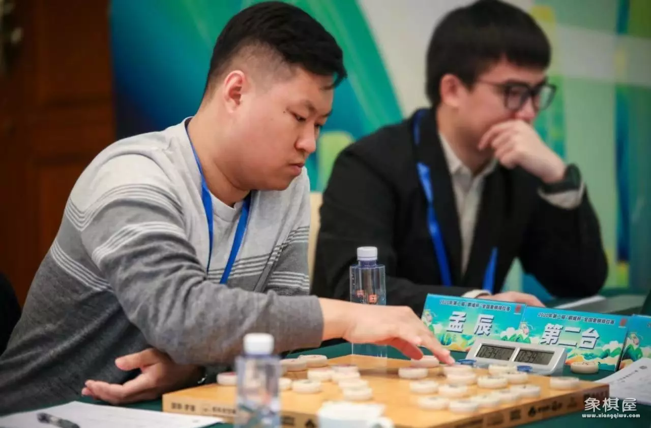 且看郑惟桐张国凤对孟辰郎祺琪这盘,郑惟桐先手飞起三相,孟辰进右马,张国凤进三兵,郎祺琪挺3卒,四人依序行棋。第七步张国凤伸炮过河将局面导入自己的准备之中,郑惟桐人称“布局专家”对此路变化也是谙熟于胸。双方迅速短兵相接,郑惟桐招招精准,孟辰郎祺琪24回合速败。