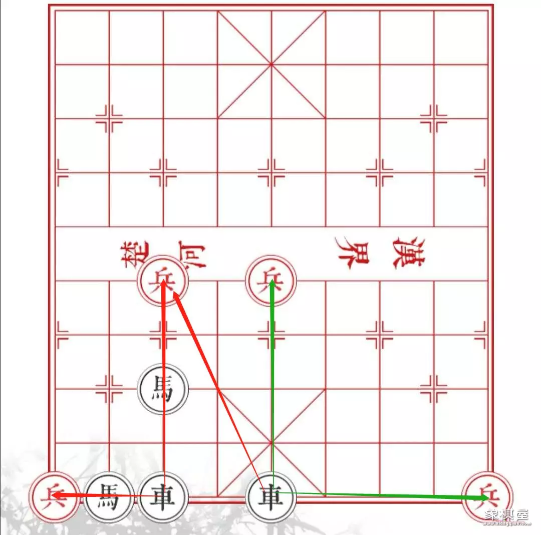 第二、善于用"黑兵"。黑兵这个特殊的棋子,因为可以自行操作,而且不会被敌军吃掉,所以它可以帮助我们的红兵完成一些行进,比如说利用黑兵"别马腿"、"堵象眼"、"挡車"、"挡炮"等一系列的辅助工作。像“瞒天过海”一关中就需要用黑兵来挡車、别马腿才可以。
