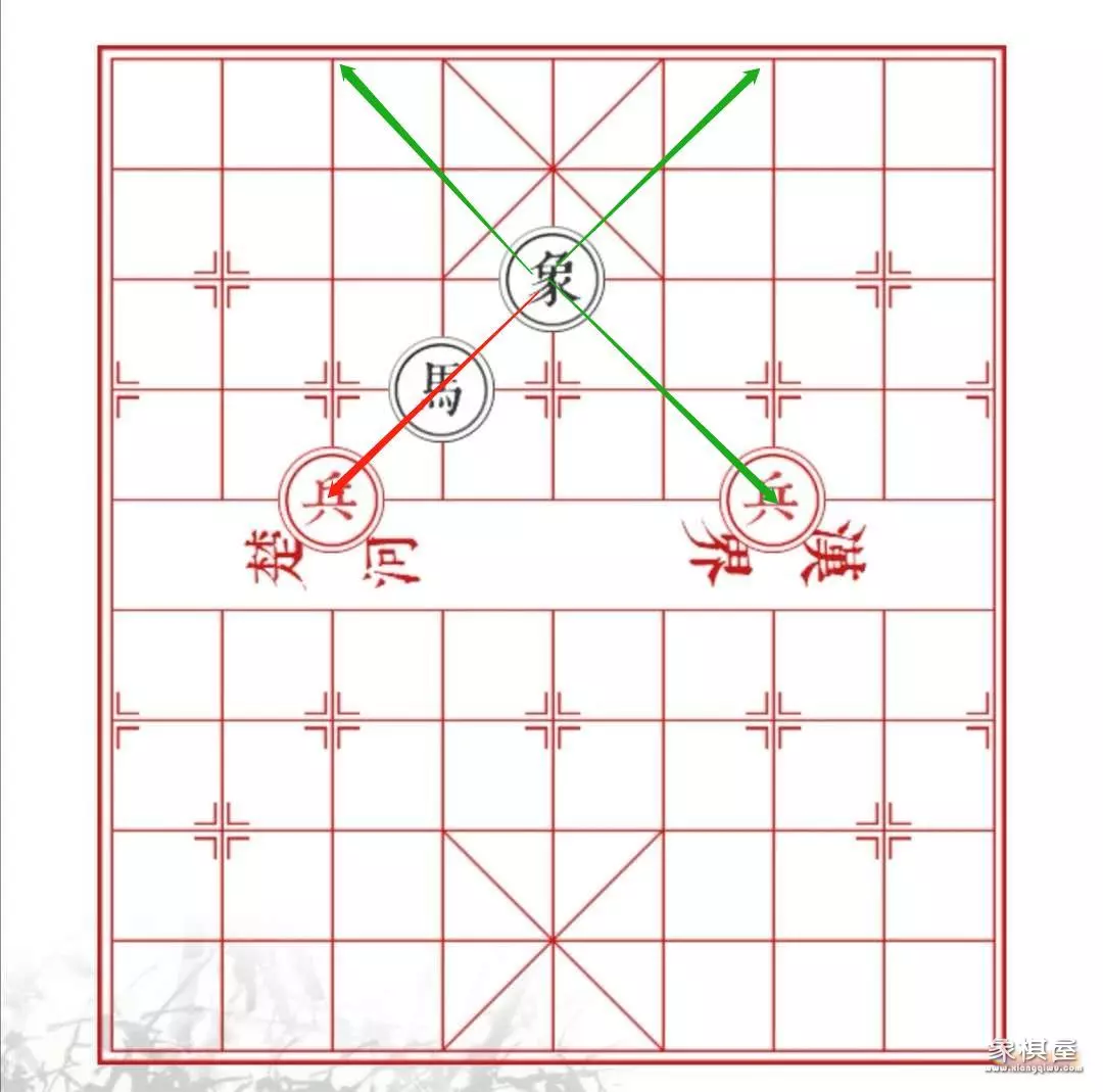 象(黑色):行进方式为走"田"字的大对角线,当与敌人处在同一对角线上时可以吃掉敌人,而"田"字的中心位置出现其他棋子时,则不可以进行攻击。