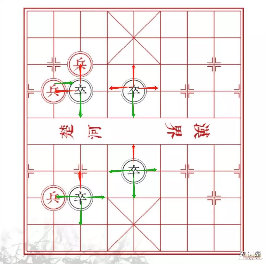 卒(黑色):行进方式为向前(从地方视角看)一步一步走,跨过"楚河汉界"后可以进行前、左、右的移动。