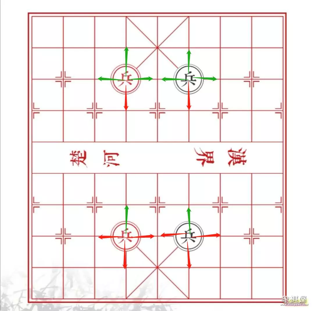 棋子在己方阵营时,只可以向前移动,过了"楚河汉界"则可以进行前、左、右的移动,不可向后走;