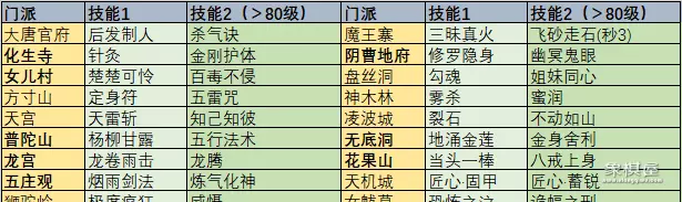孩子的门派主要影响孩子2个师门技能,跟人物一样可拜18个门派(除东海渊),门派跟技能关系整理如下: