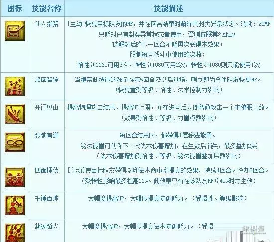 另外孩子的师门技能效果跟人物相比大多打了折扣,如pt的杨枝甘露只能拉1滴血;df的鬼眼只加一个人,且不带抗封效果......