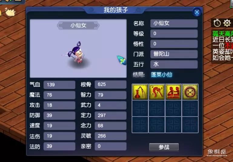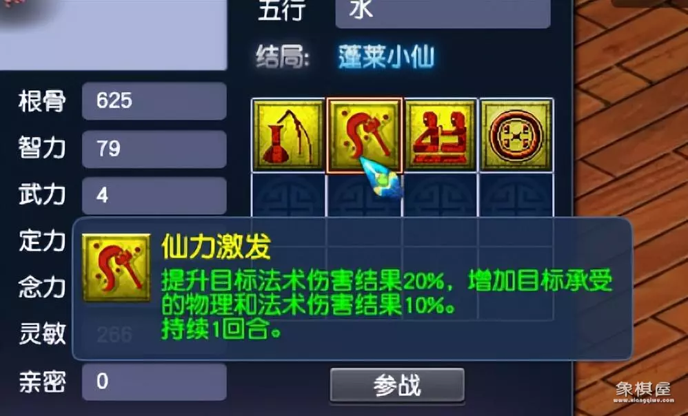 比如绝大多数的玩家都是需要一个辅助孩子,当时玩的龙宫,所以孩子拜师普陀获得拉人技能,然后要这个“蓬莱小仙”的结局技能,仙力激发刚刚好,一速给自己加buff。