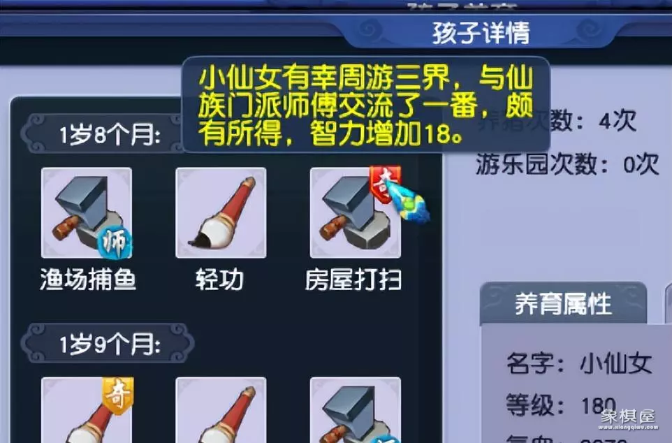 还有一个就是六艺技能,孩子成年之后可以跑六艺修行,类似环任务,一共36环。这里简单说一下,就是36环任务获得的悟性值,影响到最终获得技能的效果。