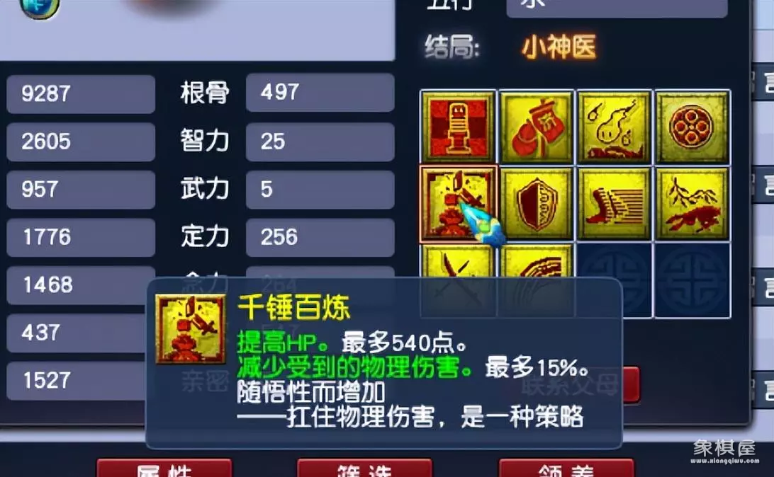 比如这个千锤百炼,提高hp最多540点,减物理伤害组多15%,就是悟性值全满的情况下。