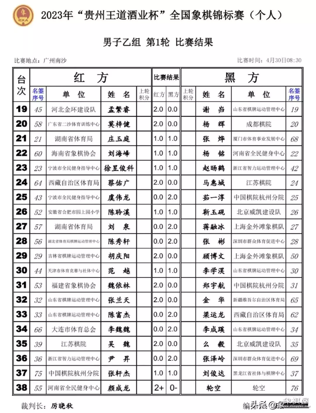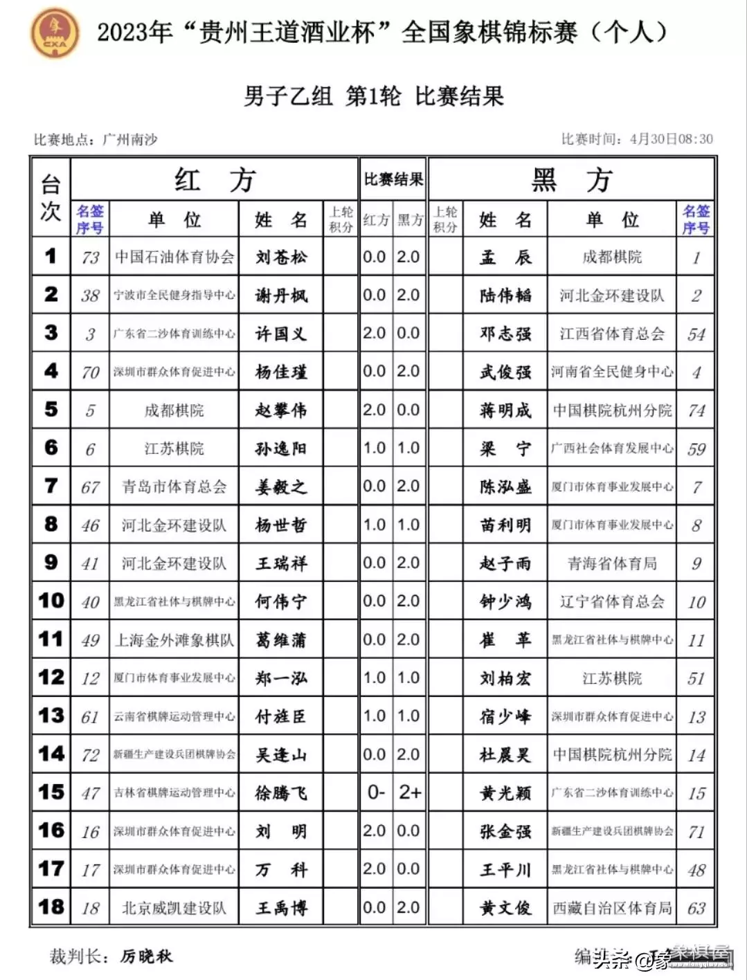 4月30日,2023年全国象棋个人赛首轮比赛在广州南沙战罢,孟辰、孟繁睿等强手纷纷获胜,广东队取得大捷,多位棋手同时赢棋,主场声威,黄文俊更是后手击败了王禹博,一显广东十虎的威名。象棋王子全程直播。