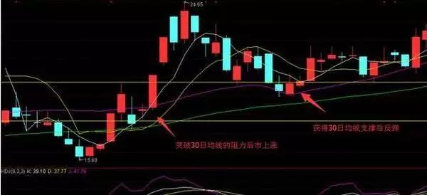 股价反弹有效突破30日均线,并且30日均线向下速度减慢,紧接着抬头开始向上,就说明下跌行情的结束,中长期上涨行情的开始。以下图为例,1月16日股价突破30日均线,但受到均线的压力后两天连续下跌,1月 21日以涨停板站上30日均线,股价上涨近30%。2月9日,股价跌至30日均线,随后股价受到支撑反弹。