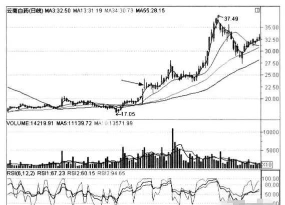 仙人指路出现以后,股价没有出现大幅上涨,但也没有大幅回落,而是沿着13日均线碎步挪移,这并非股价走势减弱,而是为了消化获利筹码而进行的强势整理,通过整理,垫高市场平均持股成本,减轻未来阻力,股价的后期走势证明了这一点。