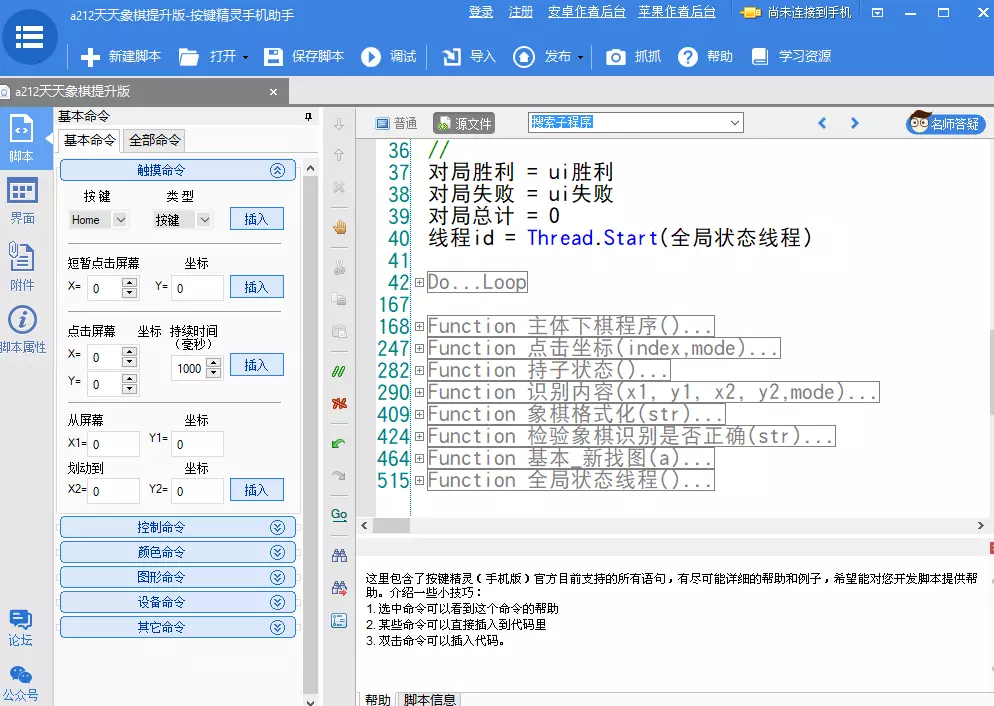 本教程将教你如何用按键精灵手机版实现这个目标。按键精灵手机版是一款可以在手机上模拟按键操作和屏幕点击的软件,它可以让你实现各种自动化的功能。我们将利用它来识别棋盘上的棋子布局,然后通过网络接口发送给后端程序,请求最佳的走法,并且在手机上执行走法。