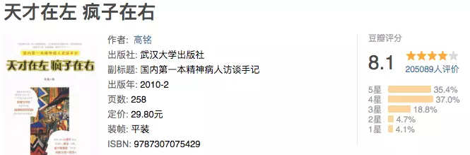 高铭的《天才在左疯子在右》这本书,用访谈录的形式记载了精神病患者、心理障碍者等边缘人深刻、视角独特的所思所想,从中可以了解到疯子亦或是天才真正的内心世界。
