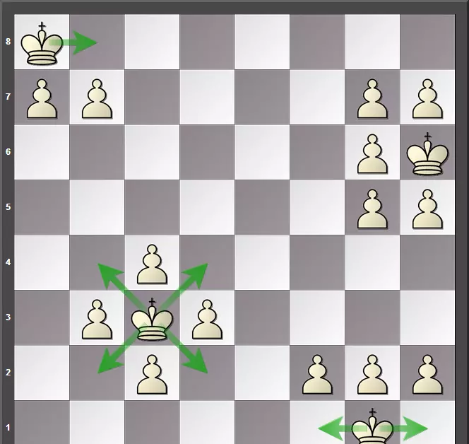 王和除了马以外的棋子一样,都不能越过其他的棋子,也不能进入己方占领的格子。如图所示,c3的王能走到b2、b4、d2、d4,但是不能走到四个白兵占领的四个格子。a8的王只能走到b8。g1的王可以走到f1或者h1。而h6的王被自己的棋子包围,没有一个格子可以走。