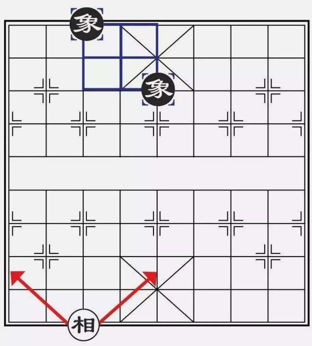 如图1,红箭头表示红相可以走到的方向和位置。黑象所走轨迹就是从田字的一角飞到对角。