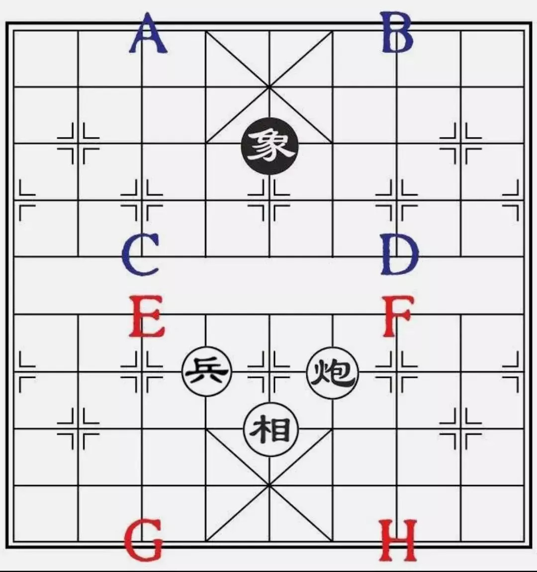如图2中,在只能走动一步的前提下,红相有红兵塞象眼,所以红相不能直接走到 E 点;同样由于有红炮塞象眼,红相也不能直接走到 F 点。红相只能走到 G 点或 H 点。黑象没有受到任何限制,所以,黑象可以直接走到A、B、C、D四个点中的任何一点。