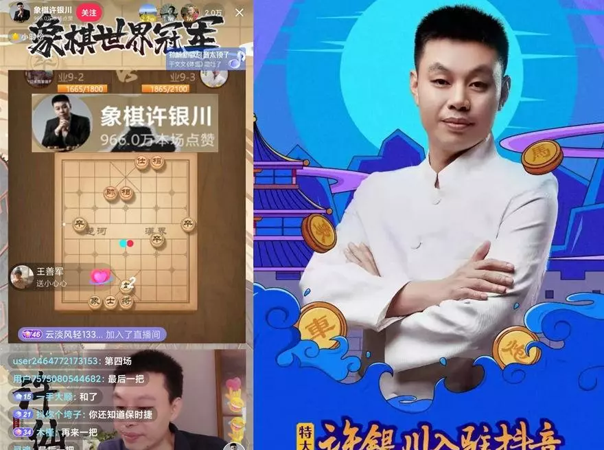 许银川登陆抖音,棋坛震动,抖音官方亲自出来,闪屏通告,许仙应约,与抖音另四位人气主播,男女大师陈栋、金松、吴可欣、林莺倾情切磋。