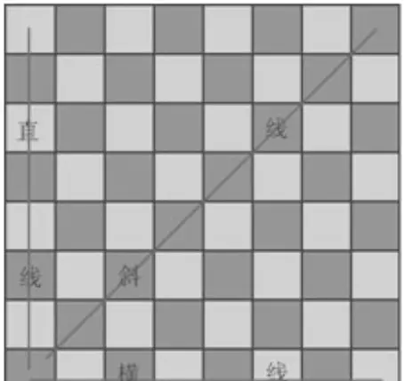 黑白64个方格构成的棋盘上,共有8条直线、8条横线以及26条由不同颜色组成的斜线。如下图。