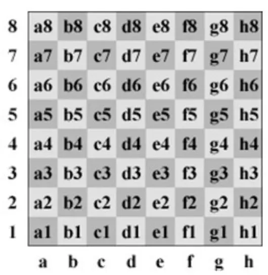 因为国际象棋规定是白方先走的,所以在命名直线和横线代号时,也以白方为标准。8条直线从白方的左边到右边分别用a、b、c、d、e、f、g、 h这8个小写拉丁字母表示;8条横线从白方到黑方分别用1、2、3、4、5、6、7、8这8个阿拉伯数字表示。因为每个方格都是直线和横线的交叉点,所以 它们可用直线的拉丁字母和横线的阿拉伯数字结合起来表示,使每个方格也都有了自己的名称,如下图。