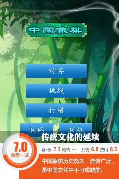 游戏虽然简单但是系统却比较丰富,有对弈、挑战、打谱、联网和联机供玩家选择。对弈就是玩家和系统对弈,玩家可根据自己的实力来选择系统的难度。挑战模式下又分为四种模式,而小编认为这种模式也是更有利于玩家学习更多套路的地方,因为其中包含了杀法大全、路边摊模式、雅趣模式和自定义模式。而打谱模式需要玩家从网上下载一些棋谱放入游戏中和系统对弈,帮助玩家研究对战的棋谱套路。联机模式下玩家可以通过蓝牙或是WIFI和自己的好友来上一局。