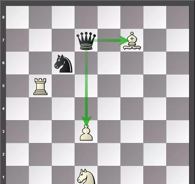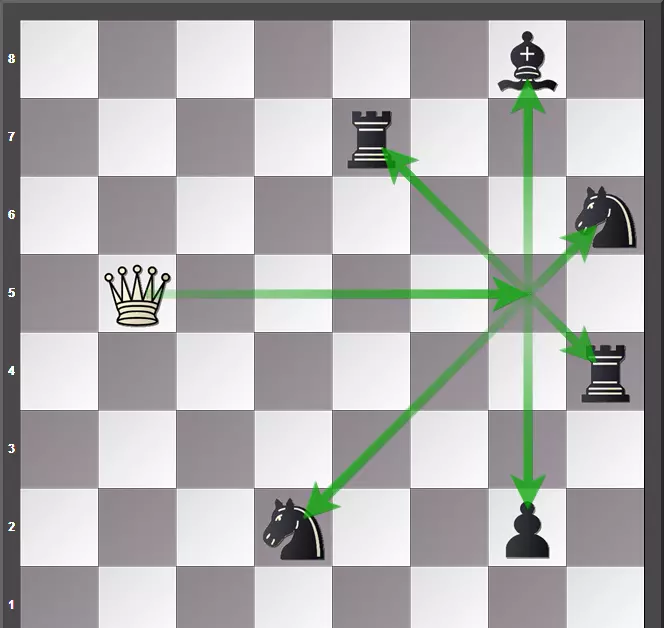 白后可以走到g5,同时攻击黑方的六个棋子,虽然在后的下一步棋只能吃掉它们中的一个。