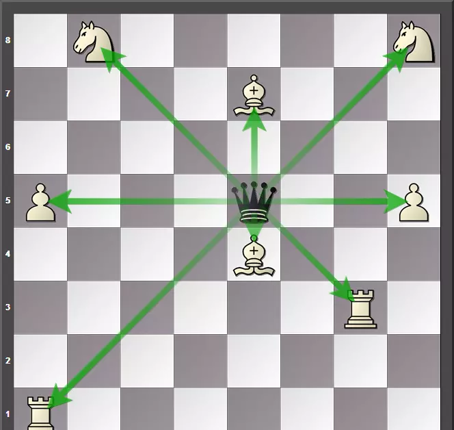 黑后能吃掉八个白棋中的任何一个,但是黑后自己并不会受到攻击。