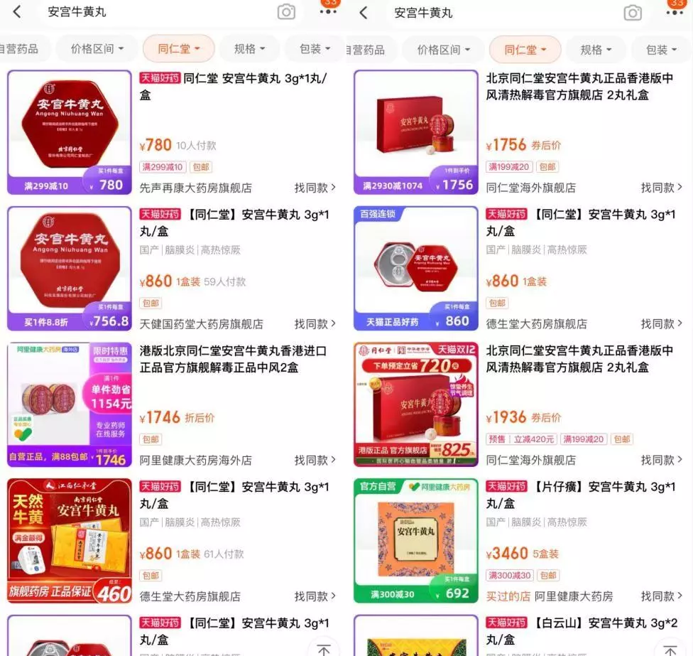 中新经纬注意到,在电商平台上,目前大部分在售的深红色包装的同仁堂安宫牛黄丸标价均已调整为860元。