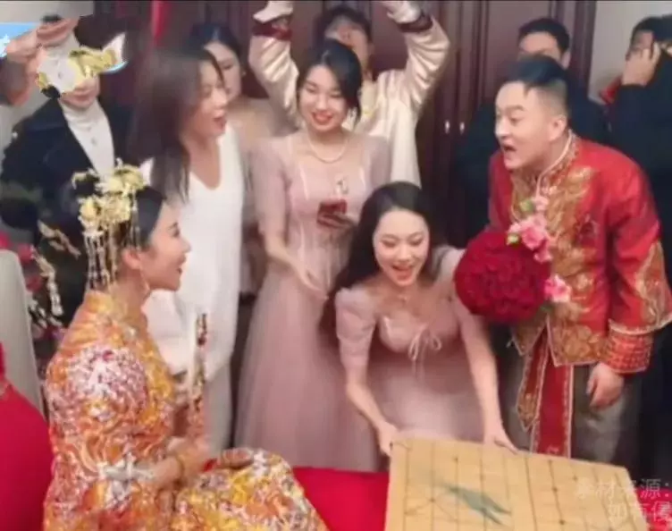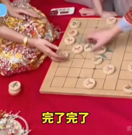 接亲新娘和新郎官下象棋比赛。这是一个别具一格的婚礼场景,以独特的方式展示了新婚夫妇之间的智慧和默契。象棋作为中国传统智力游戏的代表,既能够展现双方的智慧和策略,也寓意着夫妻间的和谐相处和默契配合。