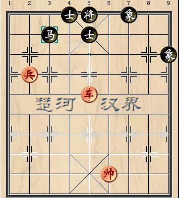来看本局,现盘上红车兵处于卒林位置,黑马在中象处,占位相当良好,红兵一时间不能靠近,车也难以护卫,怎么办,且见招式。