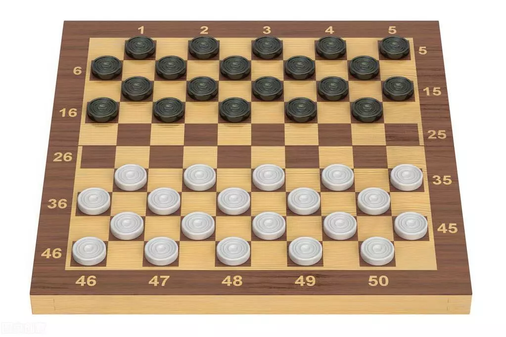 一、棋子和棋盘:国际跳棋的棋子是圆饼形,黑白各20颗。棋子放在离自己最近的四排深色格子上。