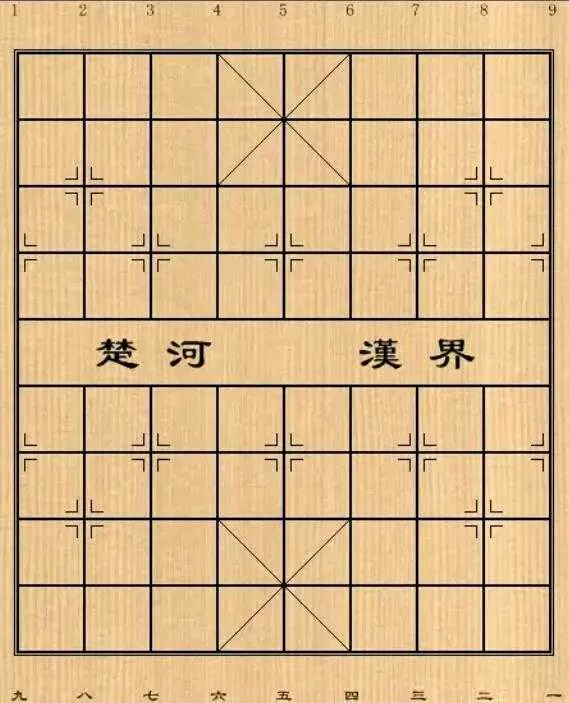 象棋是一种模拟古代战争的智力游戏,而棋盘就是红黑双方作战的战场。它共有九条直线和十条横线交叉组成。它像指挥员整天研究的地图,我们一定要认真地了解它,尤其是一些重要据点和要道。如图所示。
