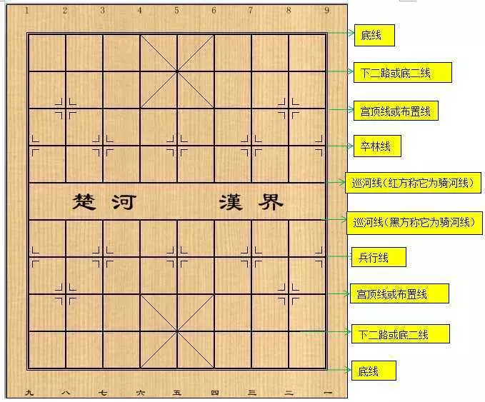 棋盘自下而上共十条横线,分别对应:底线,下二路(底二线),宫顶线(布置线),兵行线,河界线(红方这边叫巡河线,称对面黑方的河界线为骑河线),河界线(黑方这边叫巡河线,称对面红方的河界线为骑河线),卒林线,宫顶线(布置线),下二路(底二线),底线。