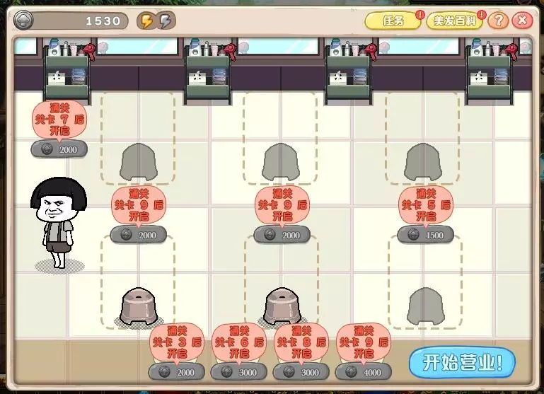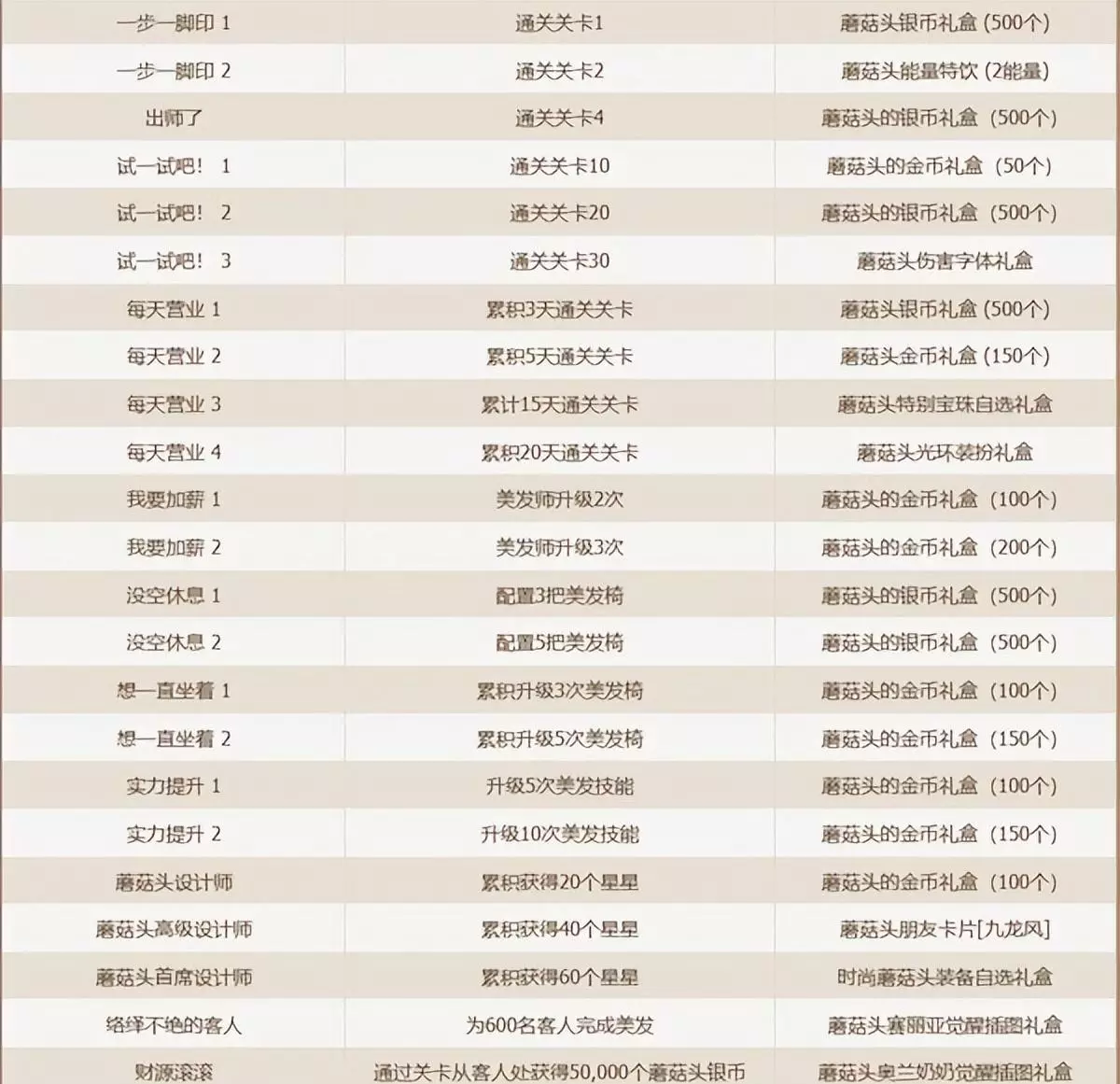 蘑菇头洗剪吹沙龙一共有30个关卡,每第一次进入一个新关卡消耗一格能量。每个关卡给客人理发可以获得蘑菇头银币和蘑菇头金币奖励,评价等级越高奖励越丰富。蘑菇头银币能使用来升级各种理发店内设施和购买道具,蘑菇头金币能用于兑换奖励。