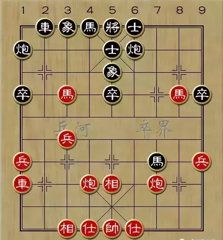 这一节课,我们学习兵(卒)的走法和吃子方法。兵和卒是象棋中棋子数量最多的兵种,每方各有5颗,如图1。象棋中为什么会有五个兵呢?在古代,军队的基本编制是,由五名步兵组成。作战兵器是弓、殳、矛、戈、戟,五种武器配合使用。这五种兵组成的基本战斗编制,反映到当时的浓缩型军事游戏——中国象棋中,便成了红黑双方各有五个兵,五人为一。