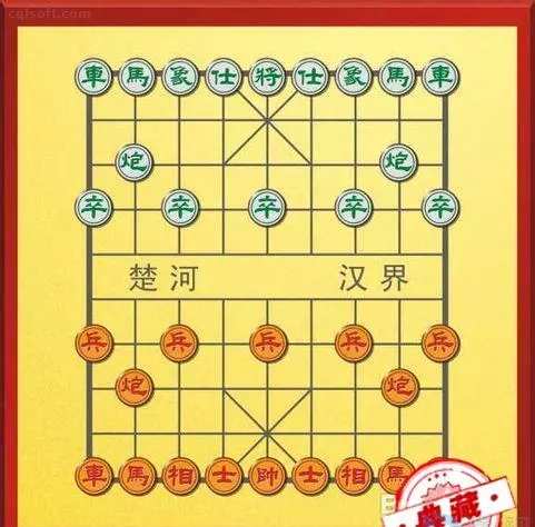 棋盘以楚河汉界分为两部分,一半为红棋,另一半为绿棋。