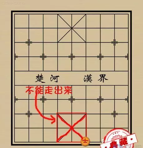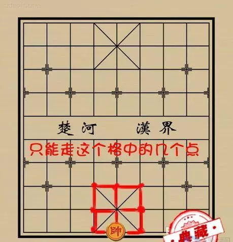 仕(士)只能在中央带斜线的田字格中走,且只能走斜线、每次只能走一步。不能出中间的田字格。