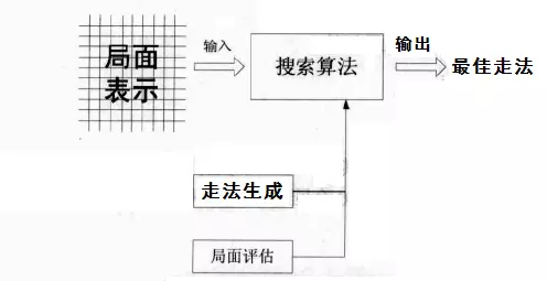 首先使用一个数据结构来描述棋局信息,对某一特定的棋局信息由着法生成器生成当前下棋方所有合法的着法并依次存入着法队列。然后通过搜索算法来逐一读取着法并调用局面评估函数对该着法所产生的后继局面进行评估打分,从中选出一个最有可能导致走棋方取胜的着法。在搜索的过程中还可以采用一些辅助手段来提高搜索的效率。